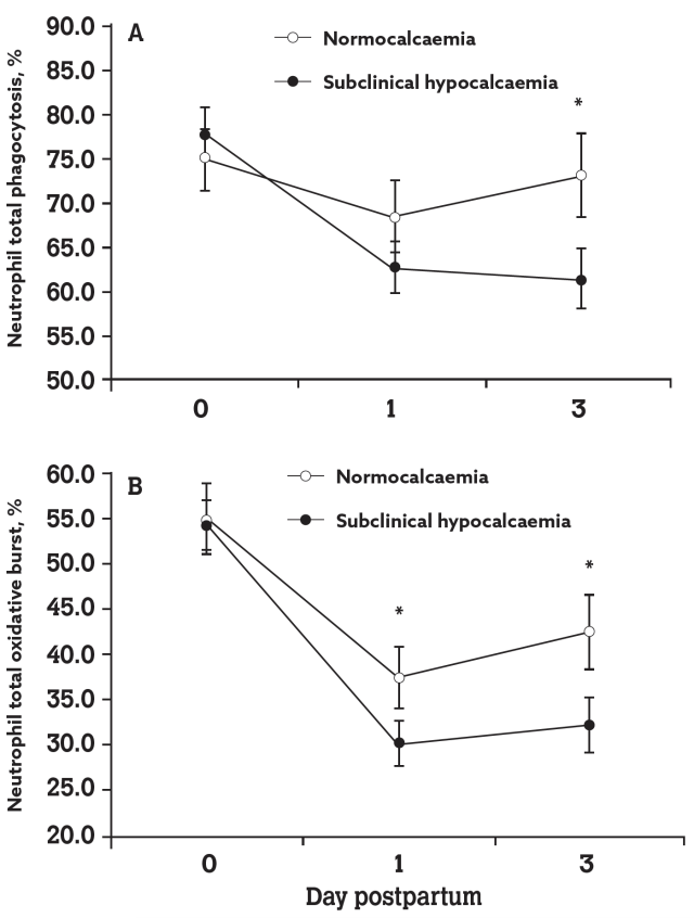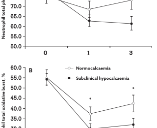 The study reported that, not only did the sub-clinical hypocalcaemic group have neutrophils with reduced in-vitro phagocytic and killing activities (graph B) but they also had a smaller leukocyte population in the blood (graph A) because of a sharp decline in neutrophils compared to normocalcaemic cows.