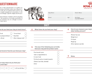 A detailed history of the pet’s current diet and eating habits should be taken. Using a food diary or questionnaire (Figure 3, for example) can provide vets and nurses with valuable information and can be very helpful for owners to document their pets’ food history and begin to understand the impact of extra calories.