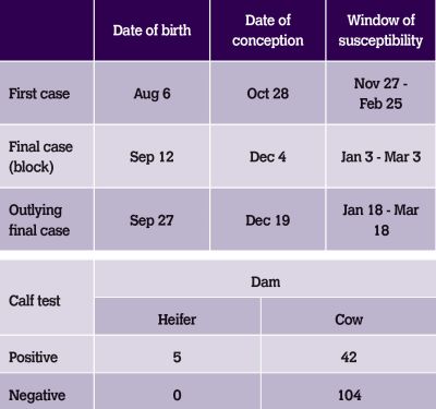 Given the number of PIs on the farm at the time, it had to be assumed that a virus would be circulating in the milking herd and bulling heifers. As the breeding season was about to start when the first positive results came through, an immediate decision was made to vaccinate all at-risk females. The availability of a single-dose vaccine with rapid onset of immunity was ideal in this situation.