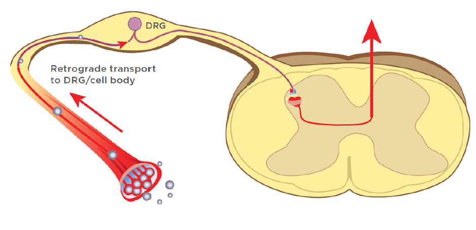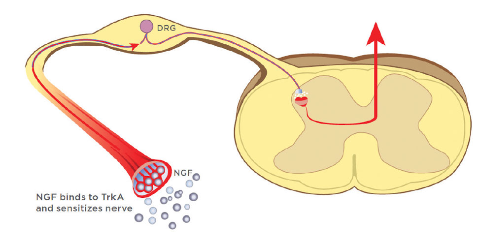 NGF, interacting with its two types of receptors on sensory nerve endings, induces changes to the nerves’ structure, anatomy and activity. NGF binds to the high-affinity receptor tropomyosin receptor kinase A (TrkA) – see Figure 4 – and the complex is internalised and moves to the cell nucleus in the dorsal root ganglion (DRG).