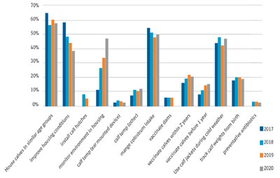 The most common methods implemented against BRD in 2020 were ensuring colostrum intake, housing calves in similar age groups and providing optimal housing conditions. These responses are fairly consistent over the past four years. However, although colostrum was cited most frequently overall, it’s interesting to note that the percentage has decreased from 87% in 2017 to 70% in 2020. Colostrum is the single most significant factor that a farm can influence to ensure that a calf has the optimum start.
