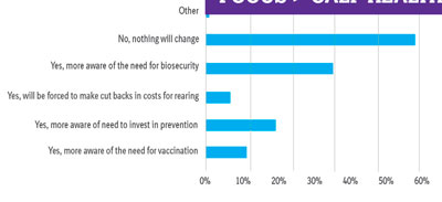 Just over half of respondents stated that nothing would change following Covid-19, which means that nearly half, 49%, will make changes. The most common response was an increased awareness of biosecurity with nearly a fifth reporting the need to invest in prevention. Although farms noted a financial impact, only 6% suggested that they would be forced to make cutbacks in calf-rearing costs. Overall, this suggests that farms are acutely aware of the positive benefits of disease prevention and that investing in prevention is likely to be more cost-effective.