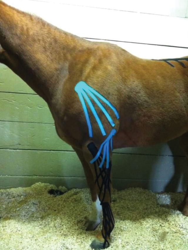 The mechanism of action for massage therapy is not fully understood. Massage therapy may induce local biochemical changes that modulate local blood flow and regulate oxygenation in muscles, subsequently influencing neural activity at the spinal cord segmental level, thereby modulating the activities of subcortical nuclei that influence both mood and pain perception. Equine massage varies in intensity from light pressure to deep ‘interrogation’ of the musculature. The bulk and weight of a horse actually does not necessitate that initial manipulation be deep and powerful, in fact gentle progression and sensitivity should be used. Massage movements should go with the lay of the hair or sometimes transversely, but not counter. Alternative working at both superficial and deep level is often performed, progressively enlarging the examined area, to assess the variety of tensions at different levels. Some specific techniques include: with the flat of the hands, with fingertips, with elbow, mobilizing massage, drainage massage (to improve lymphatic drainage). Circular movements around a cramped muscle are made by working the fingers together as a solid unit on the skin. Kinesiotaping is sometimes used in conjunction with physical therapy and stretching.