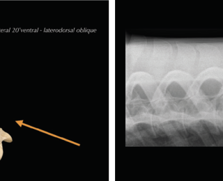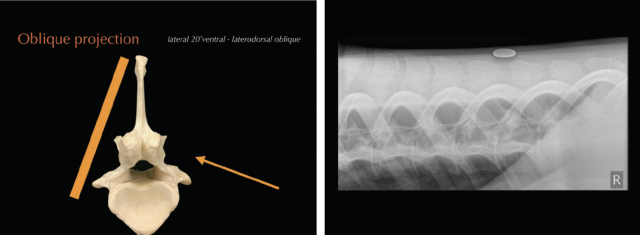 • Radiography allows the visualisation of the vertebral column, intervertebral articulations (IVAs/’facet joints’) and vertebral bodies to a varying degree, depending on location, equipment and patient size. Latero-lateral views as well as oblique projections can be obtained. Standard radiographs ideally include three to five overlapping latero-lateral radiographs using radiopaque markers, such as coins, for orientation. Collimated views of specific regions of interest can help to increase image quality by reducing scatter. Main limitations of the technique include attenuation and inability to visualise lumbar vertebral bodies. Care should be taken when interpreting or measuring interspinous spaces (ISS). Geometric distortion markedly affects the appearance of the spaces, depending on the shape and the distance of the dorsal spinous processes to the focal spot emitting X-ray beams (Djernæs et al 2017). Furthermore, the head position influences the distance between thoracic dorsal spinous processes and it is therefore advised to acquire back radiographs in a neutral position with the muzzle at shoulder level (Berner et al 2012). To further assess intervertebral articulations, oblique projections are obtained with the beam angled 20˚ from ventral to dorsal and centred 15-20cm ventral to dorsal midline (Butler et al. 2000; Girodroux et al. 2009). The X-ray plate should be aligned perpendicular to the beam and as close as possible to the horse. The highly-curved shape of the ribs is causing superimpositions with to the thoracic IVAs. In the lumbar spine there is superimposition of the transverse processes and abdominal structures.