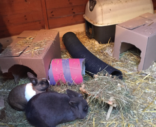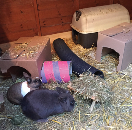 A varied diet was recommended, with unlimited access to hay and regular provisions of appropriate vegetables, herbs and fruit scattered amongst hay to encourage foraging. It was advised that concentrated feed be limited to 25g per kilogram of bodyweight, per rabbit per day, as recommended by McBride (2010). Home-made activity feeders were suggested for novelty and exploration. As an example, these can include the inner cardboard tubes from toilet or kitchen rolls, filled with hay, herbs and food treats.