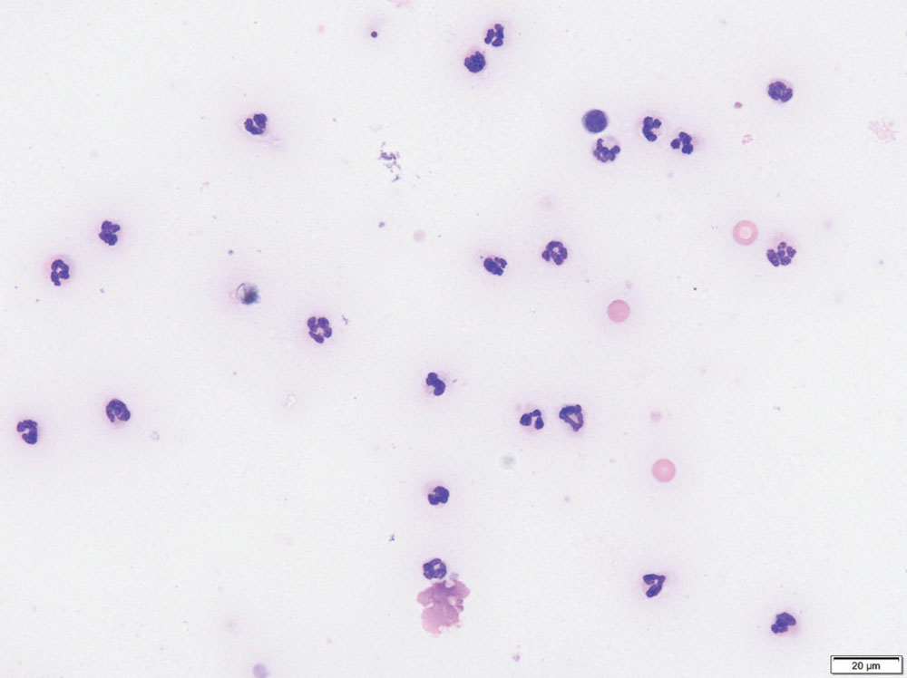 Arthrocentesis should be performed in all cases where IMPA is suspected, even if joint effusion is not present on physical examination. It may be performed early in the diagnostic process, or after the aforementioned baseline tests have been performed. Arthrocentesis should only be performed under deep sedation or general anaesthesia. Sampling a minimum of three joints is suggested to maximise the chance of obtaining a diagnosis. Because smaller peripheral joints are most commonly affected, sampling the tarsi and carpi should be prioritised.1,4 Sterile preparation of the areas to be sampled is essential to minimise the chance of iatrogenic septic arthritis. A 23-gauge or 25-gauge needle should be used, and the minimum volume of synovial fluid necessary collected, to decrease the risk of iatrogenic blood contamination of samples. Synovial fluid should be collected in an ethylenediaminetetraacetic acid (EDTA) tube for cytology and a plain tube for bacterial culture and sensitivity, and smears should be made immediately because synovial fluid cells commonly undergo rapid degradation in tubes. Normal synovial fluid should be clear and viscous.1 On cytology, normal joint fluid has a low nucleated cell count (<3000 cells/µL) and a protein concentration <2.5g/dL.29 Mononuclear cells are the predominant cell type. Synovial fluid of dogs with IMPA is often grossly turbid and less viscous. Nucleated cell count is >3,000 cells/µL, protein concentration is >2.5g/dL and on cytology non-degenerate neutrophils are usually the predominant cell type (see Figure 1). Dogs who have already received immunosuppressive medications or have more chronic disease may have a lower percentage of non-degenerate neutrophils in their synovial fluid, but a differential cell count comprising of >12% non-degenerate neutrophils is still considered consistent with IMPA.1,29 The presence of degenerate neutrophils and intracellular bacteria in synovial fluid is consistent with septic arthritis. However, it is important to note that non-degenerate neutrophils and no bacteria may be seen on cytology of joint fluid in some cases of septic arthritis, mimicking IMPA. Bacterial culture of joint fluid should always be performed in conjunction with cytology, although culture is positive in only 40-50% of septic joints.7,29,30 Differentiating IMPA from septic arthritis therefore requires thorough assessment of a dog’s history, physical examination findings and results of other diagnostic tests. Septic arthritis more commonly affects one large joint, whereas it is unusual for septic arthritis to manifest as a polyarthropathy affecting multiple smaller joints (although this is possible if haematogenous spread of infection has occurred).1