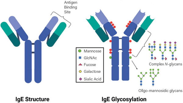 Glycosylation of the Fc regions of antibodies (Figure 1) is a post-translational modification by the addition of polysaccharide complexes. These modifications in hIgG define effector functions and have disease-specific patterns. The composition of these glycans affects the outcome of several diseases in humans including rheumatoid arthritis and response to influenza vaccination but the mechanisms are unknown. Several investigators thought that differences in glycosylation might explain the differences in IgE isotypes but Kleile-Tebbe et al (1996) found no evidence to support this theory.
