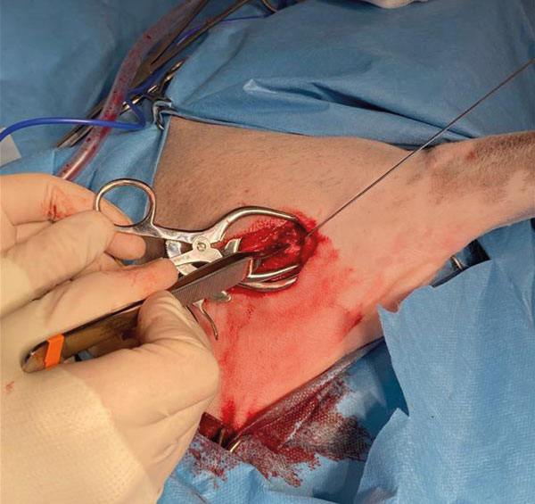 To date, the gold standard of treatment is amputation followed by earliest possible administration of adjuvant chemotherapy (cisplatin, carboplatin, doxorubricin, or combinations), yielding a mean survival time (MST) of 11-14 months from the time of diagnosis.2,4 Limb-sparing surgical techniques (LSST) can also be valuable alternatives when amputation is not an option, such as with dogs having pre-existing orthopaedic or neurologic deficits, in cases of severe obesity or when owners simply refuse amputation7. However, these techniques usually require specific surgical training and expertise, and cost and owner commitment can be significant. The standard LSST consists of marginal en-bloc resection of the tumour bone, replacement by bone allograft to reconstruct the bony column and plating of the defect, with or without arthrodesis of the adjacent joint.4,7