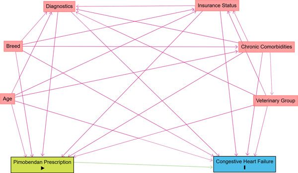 Figure 1: Directed acyclic graph (DAG) based on existing evidence and expert knowledge used to identify factors to control for when evaluating the effect of pimobendan prescription for degenerative mitral valve disease in dogs on congestive heart failure. The same causal structure was assumed to be sufficient for all-cause mortality as the outcome of interest.