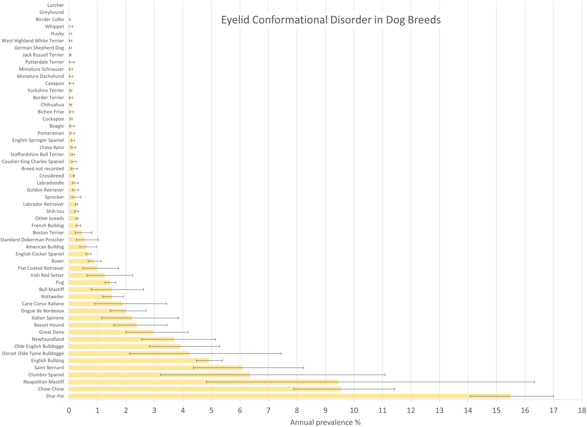 Figure 1: Annual prevalence ( per cent) of conformational eyelid disorder in dog breeds under primary veterinary care in the VetCompass Programme in the UK in 2019. The horizontal bars represent 95 per cent confidence intervals.