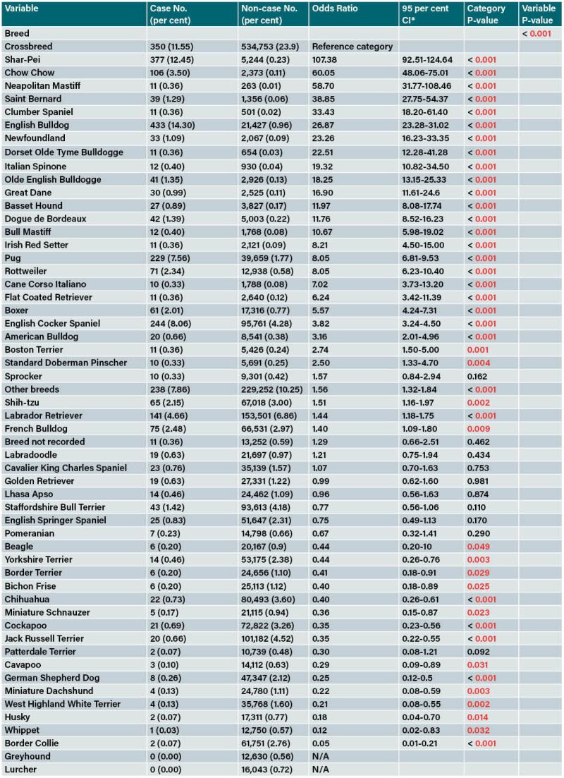 Table 1: Breed risk factors for conformational eyelid disorder cases overall during 2019 in dogs under primary veterinary care in the VetCompass Programme in the UK after accounting for confounding using multivariable logistic regression results. Column percentages shown in brackets. P-values < 0.050 are shown in red. *CI confidence interval.
