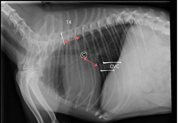 Figure 3: VLAS. Lateral thoracic radiograph with carina (c), caudal vena cava (CVC), and spinous process of the fourth thoracic vertebra (T4) identified. Distance is measured from the carina to the dorsal border of the caudal vena cava at the site where it intersects the caudal aspect of the cardiac silhouette (red line). This measurement is expressed in terms of vertebral body units using the cranial border of the fourth thoracic vertebra as the starting point.