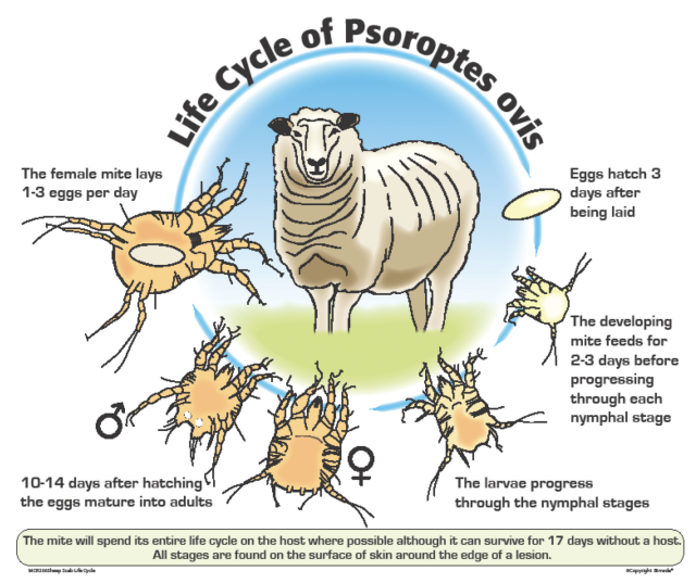 The mites are transferred from animal to animal by direct contact or on ‘fomites’, which are pieces of wool containing sheep scab mites. These mites are able to survive for 17 days without a host to feed from making it challenging to control with high potential for re-infection.