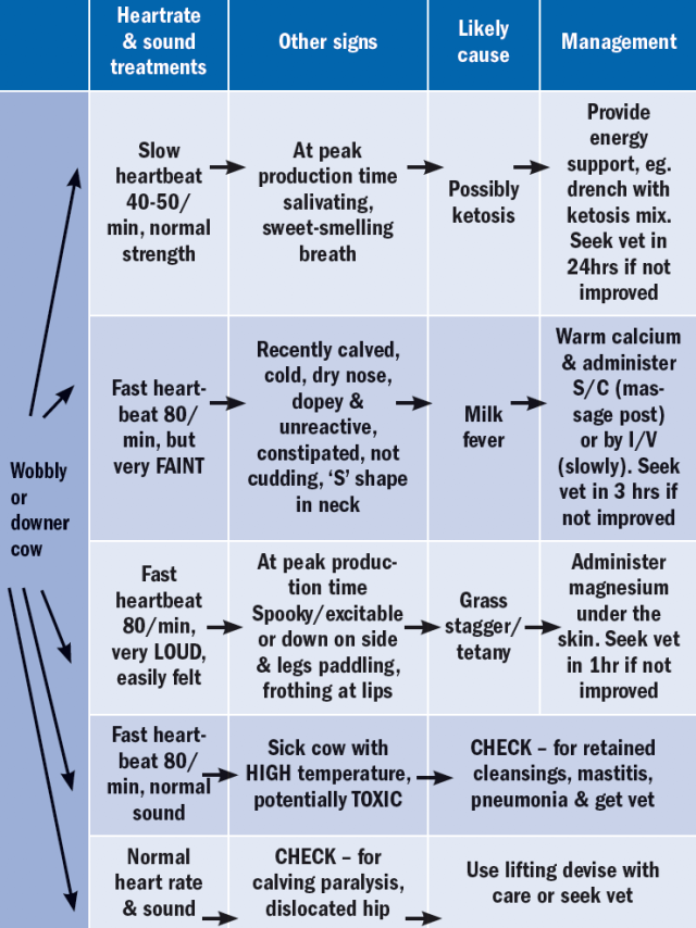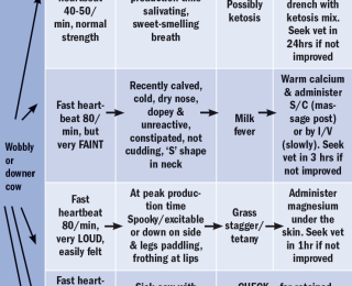 Helping farmers develop the knowledge to identify milk fever quickly can certainly be beneficial, especially where farmers are able to administer the potential treatment. However, as experience in dairying goes up and down as new people enter and older people exit the industry, there can be a role for training coupled with simple protocols and even decision trees as shown in Table 1, for a downer cow. Having such a decision tree, on farm may stop farmers presuming a downer cow has milk fever, as it’s also important to check for other conditions such as mastitis and other injuries (see Table 1).