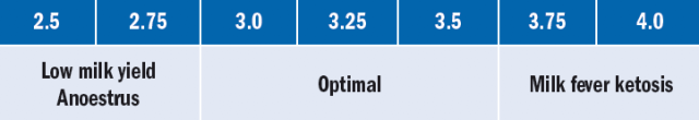 3. What is the optimal Body Condition Score of cows at calving for milk fever prevention?