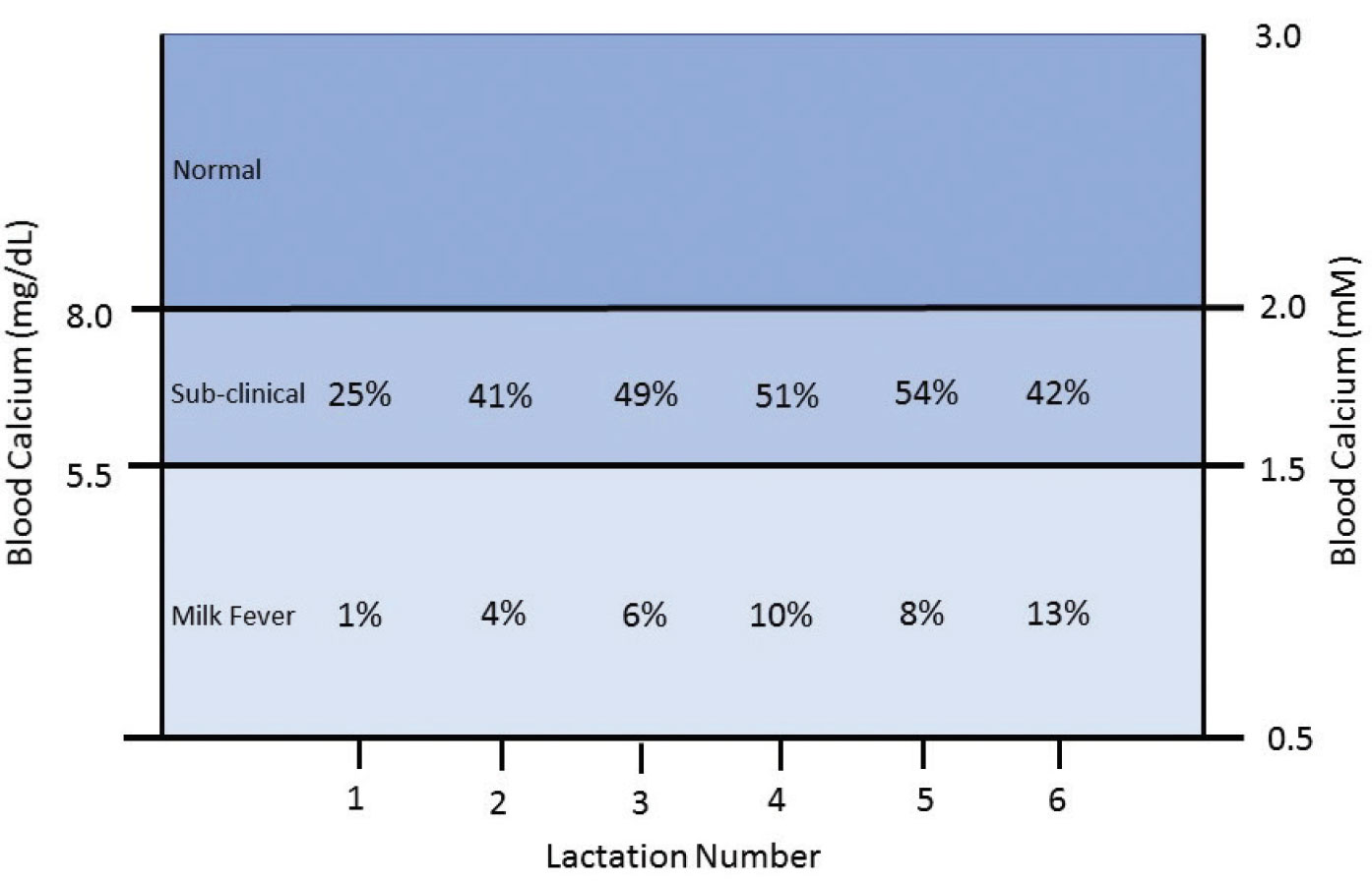 Table 1: Clinical and sub-clinical milk fever levels in cows (by lactation). Reinhardt, 2011.