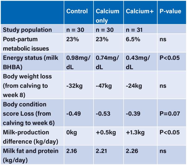 The findings of this study show that while a calcium only supplement does perform better than control in terms of milk production and milk BHBA, the calcium+ group delivered the best performance across the board. This result may indicate that while calcium is clearly an important factor, there may be merit in offering a broader spectrum transition cow supplement at calving to address the additional nutritional needs of these cows.
