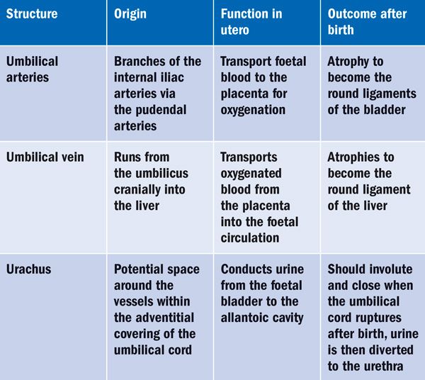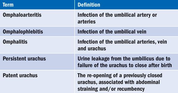 Infection of the umbilical remnants (‘navel ill’) is a common and significant condition affecting large animal neonates. The umbilicus contains the umbilical vein, a pair of umbilical arteries and the urachus (Table 1). These structures may become infected alone or in combination (Table 2). The umbilical arteries and urachus were reported as the most commonly affected structures in the horse, versus the urachus and umbilical veins in cattle.