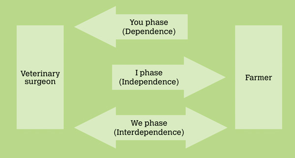 Different clients will demand different kinds of collaboration, depending on their own experience, knowledge and inclination to collaborate. This has been modelled into three different stages (Figure 1). In the ‘You phase’, the farmer is primarily dependent on the veterinarian and may trust the veterinarian to make decisions and define the objectives and action to be taken. The ‘I phase’ is characterised by a farmer acting largely independently, with the veterinarian being regarded as a provider of a certain means to an end. In the ‘I phase’ the farmer is in full control of the relationship and may use the veterinarian just as a technician, or possibly only as a writer of prescriptions and/or dispenser of medicines. Finally, the ‘We phase’ sees both the farmer and veterinarian collaborating to achieve common goals previously defined together.