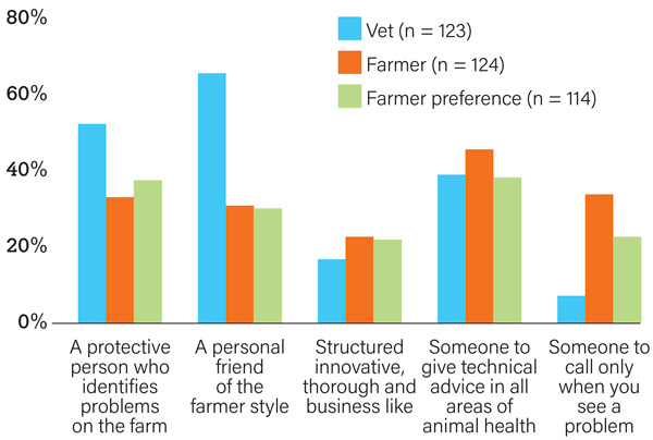 Figure 2. Frequency distribution of veterinarian and farmer responses to the question: “How do you present yourself to your dairy clients?/What approach to you and your farm do you feel your veterinarian has?/What approach would you prefer your veterinarian to have?” Source: Hall, J., & Wapenaar, W. (2012). Opinions and practices of veterinarians and dairy farmers towards herd health management in the UK. Veterinary Record, 170(17).