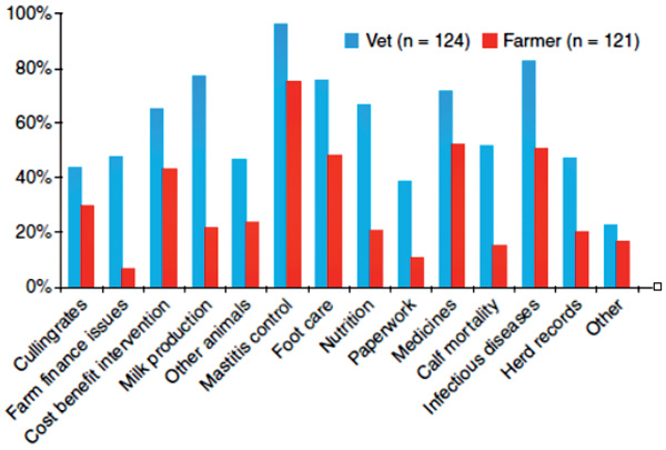 The majority of farm respondents (98 of 121; 81 per cent) valued their discussions with their herd health veterinarian, and it was apparent from the relatively small proportion of veterinarians initiating a discussion on farm (33 of 125; 26 per cent) that there is the opportunity for a more proactive approach from veterinarians. Dairy veterinarians and producers in the UK were asked about recurrence of topics of discussion and in all 14 categories veterinarians thought the topic of discussion occurred more frequently than did the producers. (Figure 3). The point of this discrepancy is not to determine who is correct, but how to improve communication and listening skills. If two parties are having a discussion and they are interviewed later, the response to “Was this discussed?” should be equal for both parties. In the same study, consultation time was perceived as valuable by 78 per cent of veterinarians and 81 per cent of farmers who both agreed that ‘discussions were good advice to put into practice’.