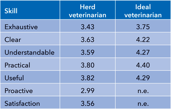 A study of dairy farmers in Italy showed that producers’ scores for their “ideal veterinarian” significantly differed from their herd veterinarian in several categories where a score of one was the lowest grade and five the highest one (Table 1).