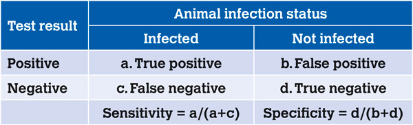Sensitivity – probability that the test will correctly detect infected animals (a sensitive test will have no false negatives; 100 per cent sensitivity).