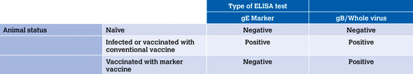 Currently, the only available serological marker tests are the BoHV-1 gE-antibody blocking ELISAs. Animals vaccinated with gE-deleted marker vaccines can be discriminated from field-virus infected animals by a negative serological reaction for gE (Table 1).