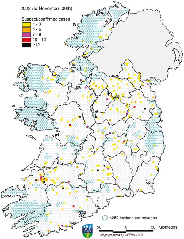 Figure 1: map showing distribution of births of BVD test+ calves during 2022 until November 30. Each hexagon represents an area of approximately 10 sq. kms. Herds located within hexagons with suspect cases in 2022, or adjacent to them, are at greater risk of having suspect cases in 2023 due to this proximity effect.