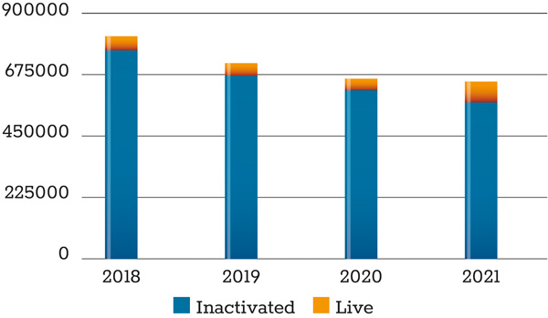 The contamination of a bovine herpesvirus 1 marker vaccine with BVD virus type 2 led to BVD outbreaks on several farms in the Netherlands in 1999 (Barkema et al., 2001). These outbreaks led to anxiety about the use of live BVD vaccines. However, this is not likely to be a significant issue as the bulk of the BVD vaccines sold on the Irish market are inactivated. In addition, the single modified live vaccine currently on the market has a double gene deletion which make a harmful mutation very unlikely. Overall, the use of vaccine has reduced over the last few years (Figure 2). Furthermore, once Ireland achieves BVD freedom, the use of BVD vaccination will be prohibited.