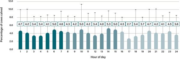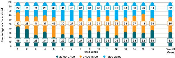When the 24-hour day was divided equally into three eight-hour periods representing ‘night’ (23:00-07:00), ‘morning-day’ (07:00-15:00) and ‘evening-day’ (15:00-23:00), the mean percentage of calvings ranged from 21-46 per cent, 27-46 per cent and 22-46 per cent, respectively, across the 16 herd-years (Figure 2). The overall mean percentage of calvings for the 16 herd-years distributed in the three eight-hour periods was 33, 35 and 32 per cent, respectively (Figure 2).