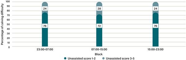 Figure 3: Distribution of calvings in three 8-hour periods (‘night’, 23:00-07:00; ‘morning-day’, 07:00-15:00, ‘evening-day’, 15:00-23:00) according to calving difficulty classification. Calving difficulty score (1-5) was categorised as either ‘unassisted’ (score 1-2) or ‘assisted’ (score 3-5).