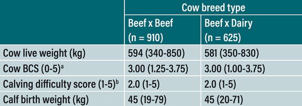 Table 1: Mean (min and max) post-calving cow live weight, body condition score (BCS), calving difficulty score and calf birth weight.