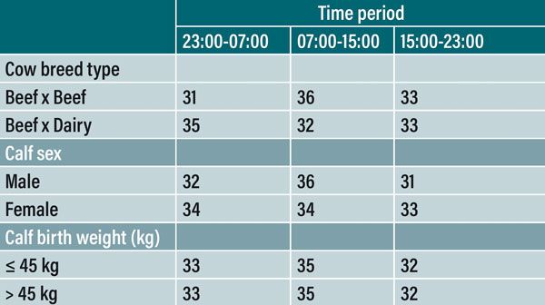 The distribution of calvings in the three 8-h periods (23:00-07:00, 07:00-15:00 and 15:00-23:00h) for Beef × Beef and Beef × Dairy cow breed types, male and female calves and ‘light’ and ‘heavy’ calves is shown in Table 2. Cow breed type, calf sex and calf birth weight classification were relatively evenly distributed over the three 8-h blocks.