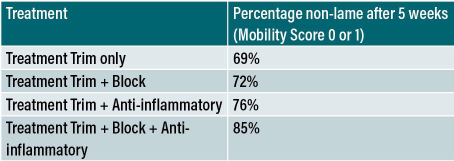 Table 2: Effect of different lameness treatment strategies on recovery rates after five weeks (Thomas et al, 2015).