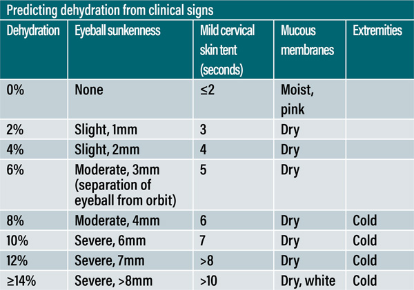 When giving intravenous fluid therapy, assess the percentage dehydration (degree of enophthalmos [mm] x 2 approximately) and multiply by bodyweight.