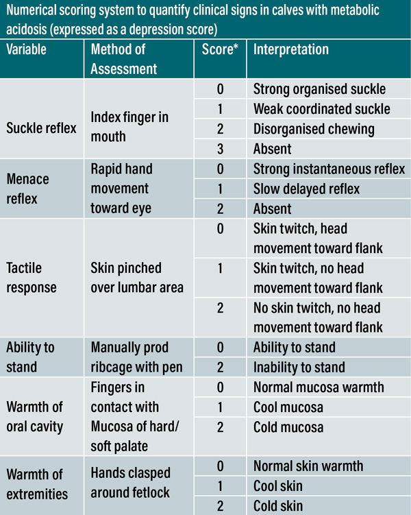 In a hospital setting, a blood gas analysis would be performed to determine blood pH and the base deficit of plasma bicarbonate (HCO3). However, as this is not feasible in general practice, a numerical scoring system to quantify clinical signs in calves with metabolic acidosis was developed (Figure 2) to give guidance on how to determine the severity of the acidosis (Kasari and Naylor, 1986).