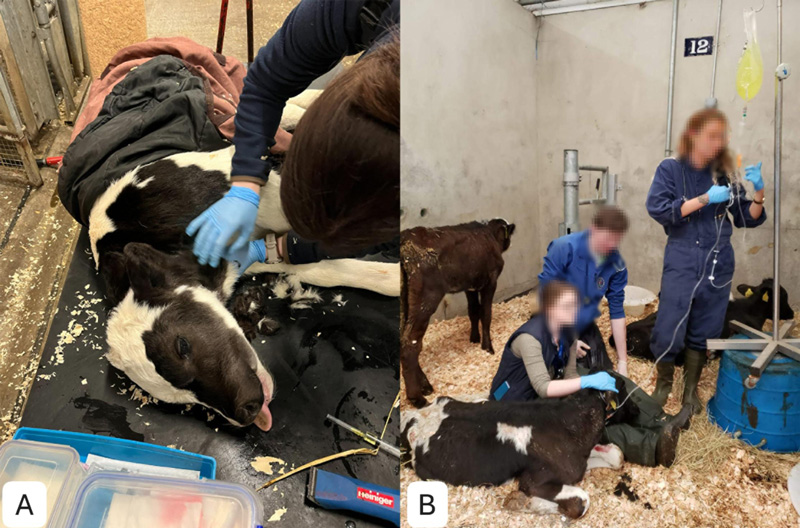 Figure 3: Intravenous fluid therapy in calves: (A) calf with dehydration, severe metabolic acidosis, and ruminal acidosis from tubing of milk; (B) calves receiving IV fluid therapy.