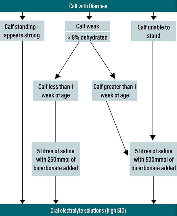 Depending on the calf’s demeanour, and its ability to stand and suck, the decision has to be made whether to administer fluids orally or intravenously. If a suck reflex is still present and the calf is only mildly dehydrated, oral rehydration therapy is indicated. An oral solution must satisfy four main requirements: