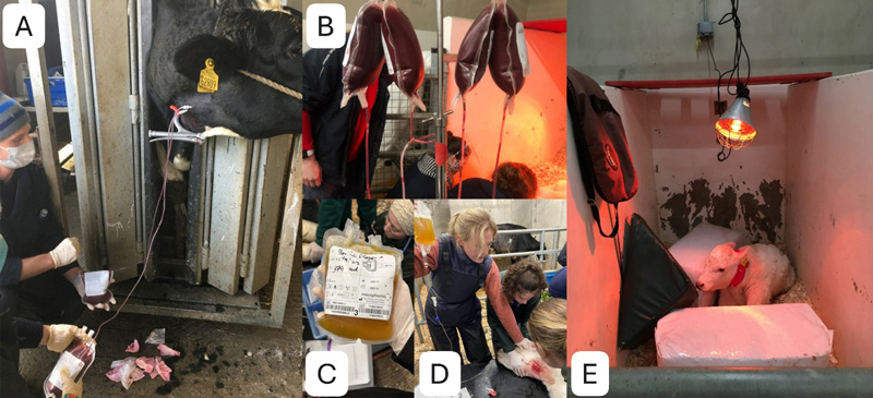 Figure 5: Calf receiving a plasma transfusion: (A) taking blood from the recipient dam; (B) blood bags containing anticoagulant; (C) plasma separated into another bag after centrifugation; (D) administration of plasma to the calf with FPT; (E) calf post-transfusion under a red lamp for warmth.