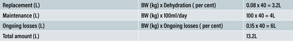 Table 1: Example of fluid requirements for replacement, maintenance, and ongoing losses in a 40kg calf with NCD.
