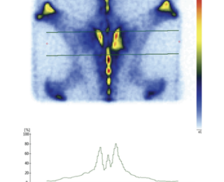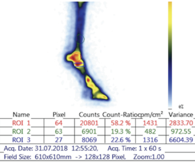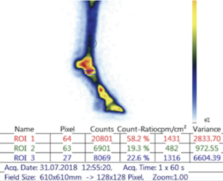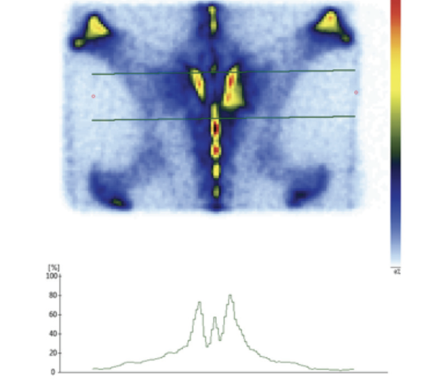 Presently, clinicians have a good understanding of scintigraphy’s diagnostic capabilities and limitations, the expected variations between horses of different ages and uses, of the predilection sites for injury, and the types of injuries diagnosed with specific sites of increased radiopharmaceutical uptake. The newer scintigraphy machines require minimal post acquisition processing to obtain an image of diagnostic quality, with digital systems providing motion corrected images (summated dynamic acquisitions) at the time of acquisition. ‘Count stealing’, where a structure, typically bladder or a physis, can have such intense uptake that the remaining structures in the field of view are poorly visualised. This phenomenon can be easily corrected by cropping the offending structure from the image when processing to allow representation of the remaining structures. Acquiring images dynamically over a set period of time, rather than a set number of counts, results in no loss of detail in images where cropping of structures that are count stealing is performed. Image interpretation can be subjective or objective. Some cases have obvious pathology that requires no more than subjective analysis, however care must be taken not to miss pathology. Appropriate cropping and equilibration of image intensity is often all that is required. Objective measurements usually involve either region-of-interest measurements to quantify the number of counts per pixel (see Figure 2), or profile analysis to provide a graphical representation of radiopharmaceutical activity (Figure 3).