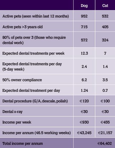 Figure 2 conservatively looks at the average cost of a ‘dental’ in Ireland, keeping in mind that these procedures are being undercharged. Working on just 50 per cent owner compliance, only patients over the age of three years, excluding pre-anaesthetic blood tests, excluding post-operative analgesia and before a single extraction, the figures speak for themselves.