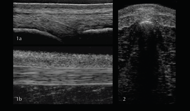 In the thoracic (saddle) region the SSL is thin and wide, whereas further caudal in the lumbar region the ligament is thick and narrow with a more echogenic, homogenous appearance. The transverse view of the SSL is less useful due to being more prone to artifacts. In order to achieve the best image quality, the transducer should be tilted cranially and caudally. Published scientific data about the ultrasonographic appearance of the SSL in normal horses and horses with back pain offering information about the potential clinical significance is limited (Henson et al 2007). The clinical significance of heterogenous regions in the SSL should therefore be questioned and further tests, such as diagnostic local anaesthesia, should be applied.