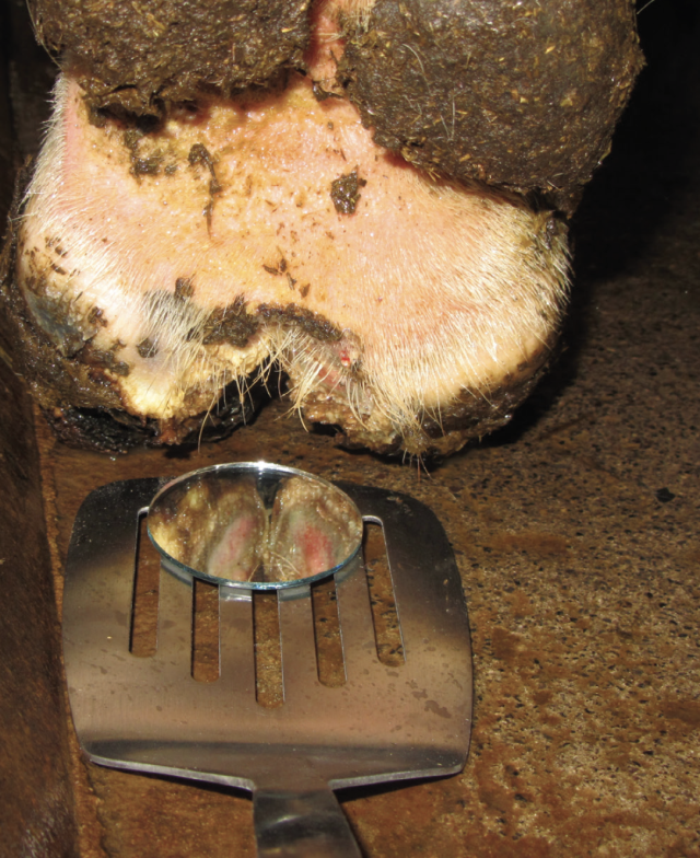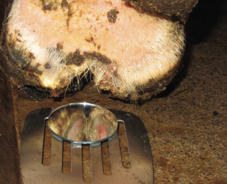 Not all cows with active/recurring DD lesions will be lame, therefore mobility scoring is not a reliable way of detecting all lesions. Instead, feet must be inspected individually. The easiest way to do this is when the cows are in the parlour during milking. Washing the feet off first and using an inspection mirror and torch will all increase the chances of spotting all lesions (Figure 8). For dry cows, youngstock or robotic herds this can be carried out at the feed barrier but is hindered if the feet are dirty, so extra caution needs to be taken when deciding if a cow needs further inspection or not. All cows with active/recurring lesions should be recorded as requiring treatment.