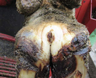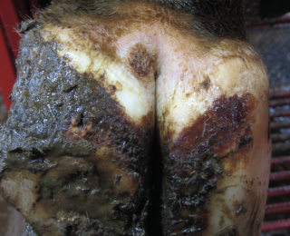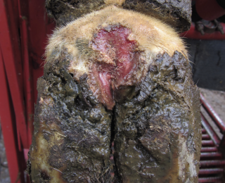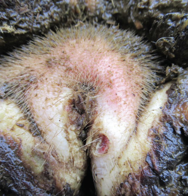 Dormant/M4: No ulcerative lesions are present, and the lesion is not painful, however, the interdigital cleft is no longer smooth. Instead there is either hyperkeratosis of the skin around the interdigital space, resembling a horseshoe shape (Figure 6) or the lesion may appear as a ‘hairy wart’ with proliferative filaments of skin present.