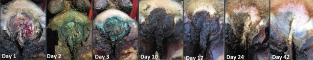 Healing/M3: Topical therapy results in the formation of a firm black scab over the lesion within one to two days (Figure 5). If treatment was administered early enough, before encysting of the bacteria, and is successful then the lesion may appear uninfected once the scab has sloughed off. However, if treatment is delayed and proliferation has occurred a true cure is unlikely and the cow now becomes a ‘carrier’. In some cases, if there is incomplete healing or the cows are passing through an aggressive footbath a scab may form, however, once the scab has fallen off the lesion may revert to an active lesion.
