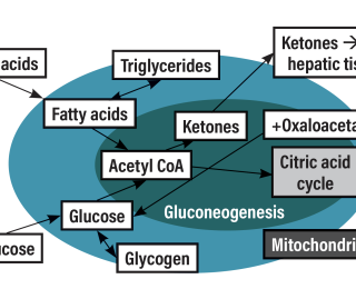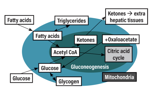 Ketone body production itself is a normal attempt of the body to provide an alternative energy source for cells in the absence of glucose. Figure 1 shows how fat stores are mobilised and fatty acids then oxidised by the liver to form ketones which can be transported to extra hepatic tissues. Increased gluconeogenesis in the liver also depletes intermediates of the citric acid cycle and diverts acetyl-CoA to ketone body production.