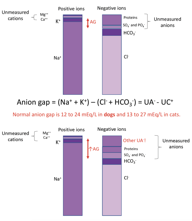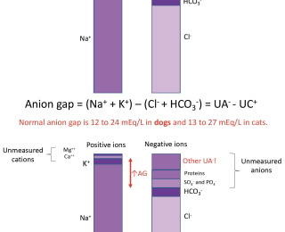 Calculation of the anion gap could be helpful if there is no access to a ketometer and urine cannot be sampled. However, it requires bicarbonate which may not be routinely measured. Figure 7 shows how to calculate the anion gap. The anion gap is typically 12-24mEq/L in dogs and 13-27mEq/L in cats.