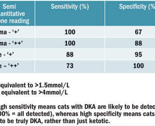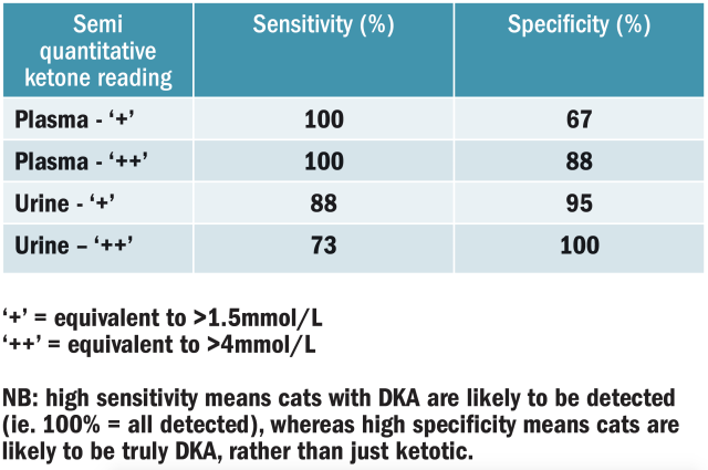 Only practices with the ability to run blood gas analysis will be able to truly diagnose DKA. Where this is not available, some studies have tried to investigate the degree of ketonaemia or ketonuria that is consistently associated with acidaemia. Dogs with ketones >3.8mmol/L and cats with ketones >2.4-2.5mmol/L are more likely to have DKA. Values less than this, particularly if <1-2mmol/L suggest although the patient may be ketotic, it is unlikely the primary cause of systemic illness (Weingart et al, 2012; Zeugswetter et al, 2010).
